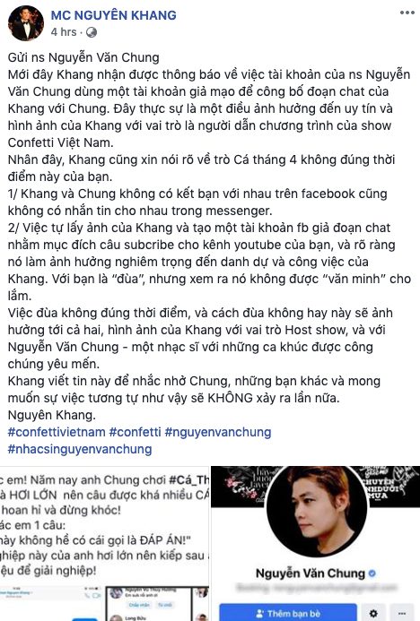 Về phần mình, MC Nguyên Khang khẳng định không phải là chủ nhân của tài khoản đang có tương tác với nhạc sỹ Nguyễn Văn Chung. MC Confetti Vietnam bên cạnh đó cho biết anh chưa kết bạn chung với nhạc sỹ Nguyễn Văn Chung và cũng chưa hề nhắn tin với nhau. MC Nguyên Khang nói thêm anh không rõ mục đích của nhạc sỹ Nguyễn Văn Chung là gì tuy nhiên nó đã làm ảnh hưởng tới hình ảnh của MC Nguyên Khang trong vai trò người dẫn chương trình của Confetti Vietnam. Trước đó, nhạc sỹ Nguyễn Văn Chung được biết đến là một người khá chăm chỉ chơi và bình luận trên Confetti Vietnam. Có nhiều số phát sóng MC Nguyên Khang thậm chí còn đọc những bình luận hóm hỉnh của nhạc sỹ này để chia sẻ với người chơi.