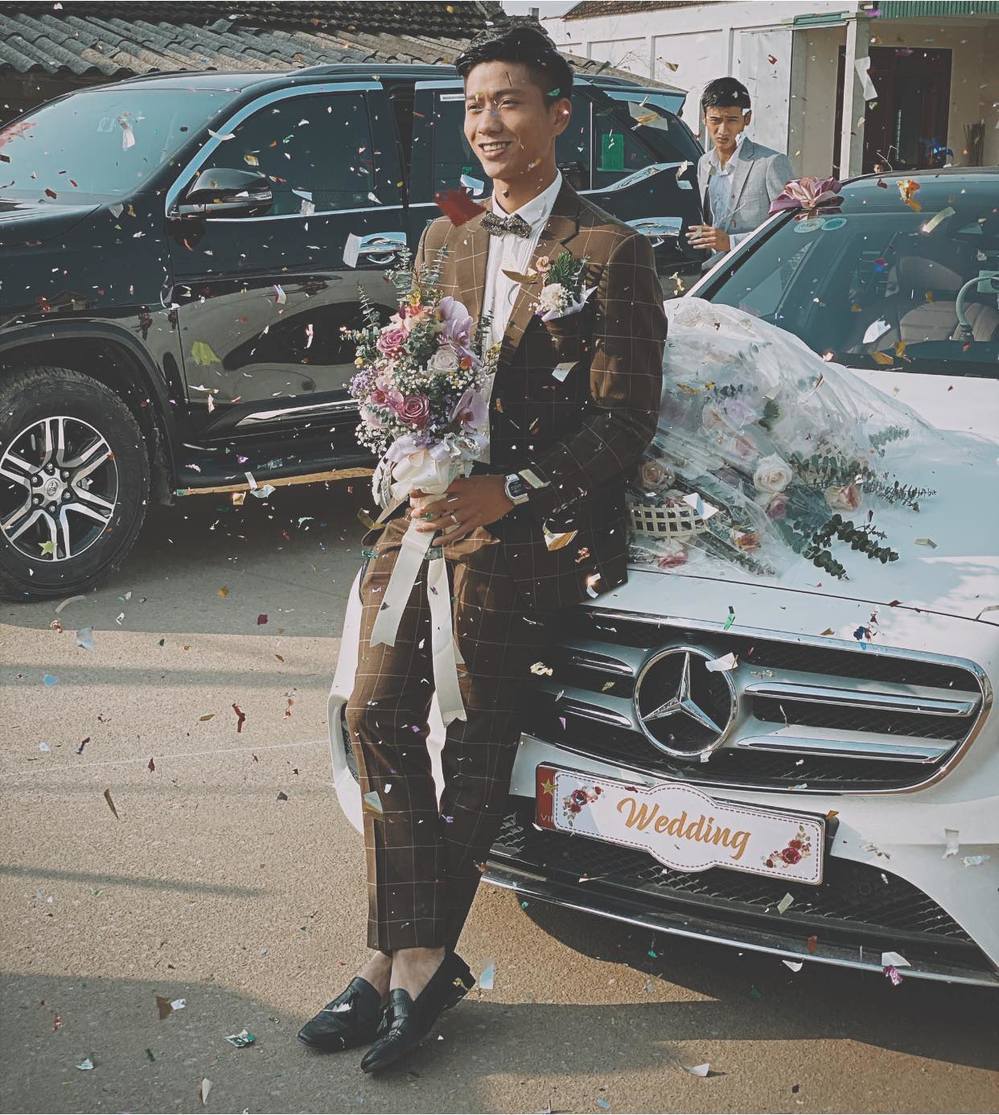 Phan Văn Đức diện vest bảnh bao bên cạnh chiếc xe sang Mercedes màu trắng tinh khôi dùng để rước cô dâu Nhật Linh. (Ảnh: FBNV)