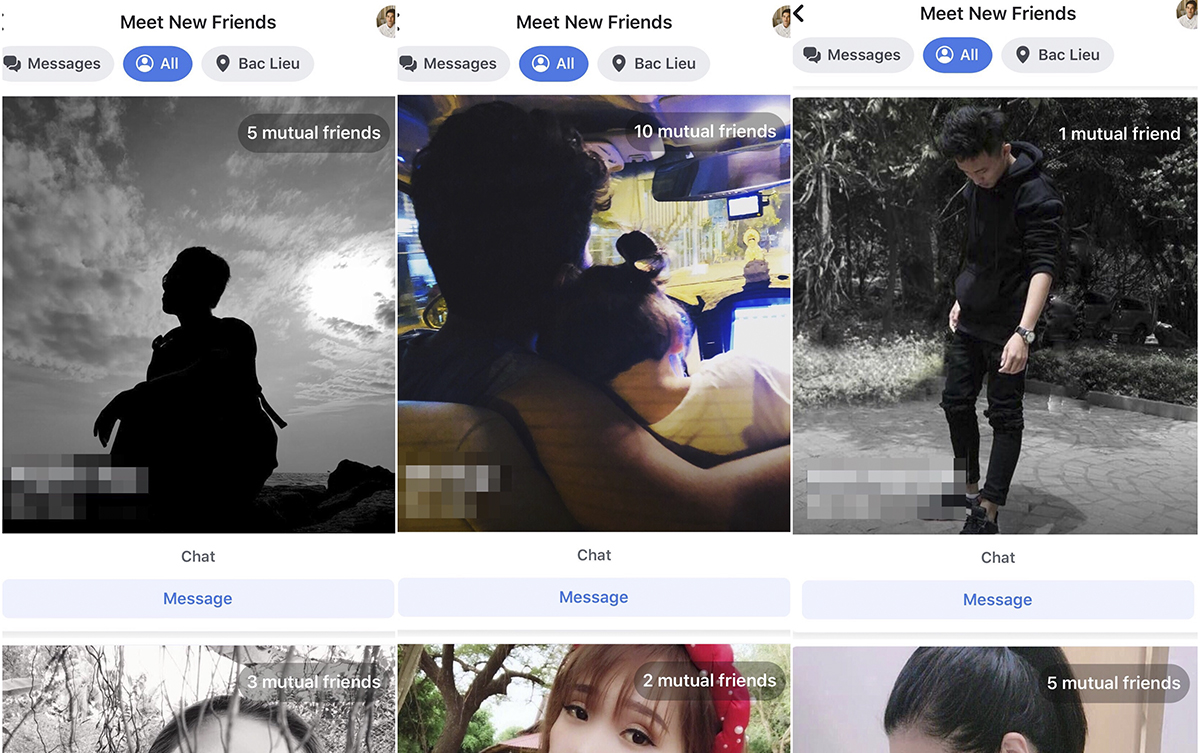 Tiếp theo, Facebook sẽ đưa ra các tiêu chí để người dùng lựa chọn tìm bạn mới theo nơi sinh sống, trường học,… lúc này bạn chỉ cần ấn “Tiếp tục” (Next). Sau đó, những tài khoản Facebook mới sẽ hiện ra dựa theo các tiêu chí mà người dùng lựa chọn. Cuối cùng, để làm quen với người bạn mới, người dùng nhấn vào “Nhắn tin” (Message) để bắt đầu câu chuyện.