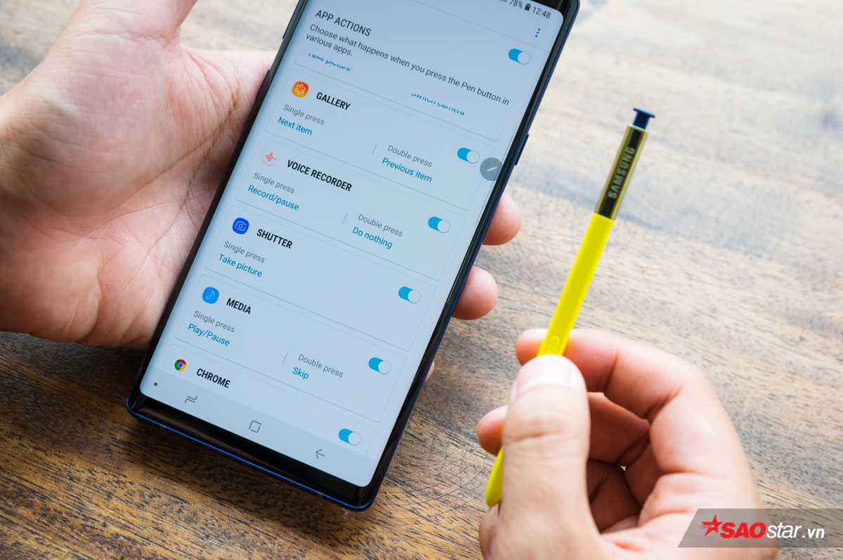 Một điểm nhỏ nữa là bút S Pen mới có thể gọi nhanh một ứng dụng khi nhấn giữ nút trên thân. Mặc định là ứng dụng chụp ảnh, tuy nhiên người dùng có thể đặt lại ứng dụng khác để phù hợp với nhu cầu sử dụng. Những trường hợp không rảnh tay thì có thể mở nhanh ứng dụng là một điểm cộng cho Galaxy Note9 với S Pen mới về tính hữu ích.
