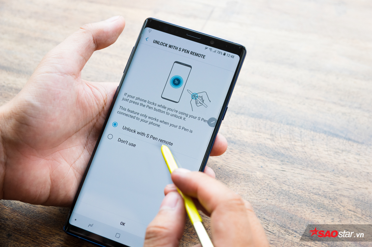 Samsung rất biết cách khai thác triệt để kết nối Bluetooth bên trong S Pen. Mặc định Android có tính năng cho phép người dùng chọn thiết bị bluetooth đáng tin cậy để cấp quyền mở máy. Trên S Pen mới, Samsung tận dụng điều này để người dùng có thể mở khóa Galaxy Note9 từ xa (trong phạm vi của kết nối bluetooth) với chỉ một nút bấm. Tùy chọn này mang lại thêm một cách mở khóa linh hoạt khác nữa cho mẫu smartphone cao cấp này, bên cạnh cảm biến quét mống mắt, nhận diện khuôn mặt và cảm biến vân tay.