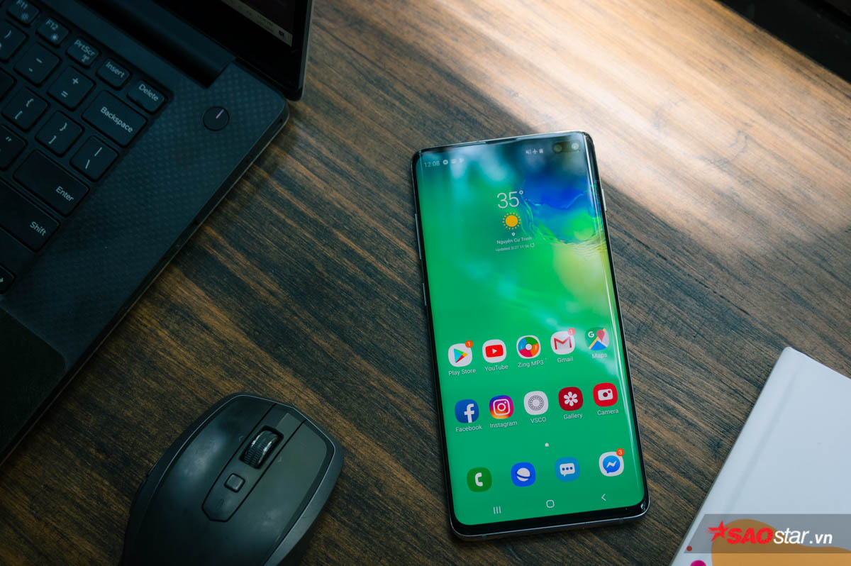 Với hình dáng thon dài, cạnh màn hình vuốt cong nhẹ về hai bên giúp Galaxy S10+ thực sự ấn tượng đối với tôi ngay từ cái nhìn đầu tiên. Màn hình Infinity-O chiếm trọn mặt trước, cụm camera selfie giờ đây được nằm gọn gàng một góc phía bên trong mang đến vẻ hiện đại, đậm chất công nghệ hơn so với dạng tai thỏ mà tôi đã dùng trên iPhone suốt hai năm qua.