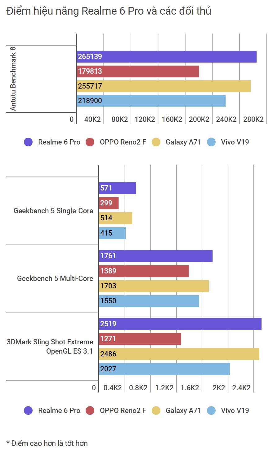 Nhưng điều thú vị là hiệu năng phiên bản Pro là tương đồng với những gì Realme 6 thể hiện trong các bài benchmark. Tuy vậy ưu điểm của vi xử lý “họ nhà Rồng” chính là việc tối ưu cho game tốt hơn nên mức khung hình luôn ổn định, dù trong các pha combat đông người ở Liên Quân Mobile hay ngắm bắn trong PUBG Mobile. Nếu bạn muốn có smartphone chơi game tốt thì dù Realme 6 Pro mắc hơn bản thường 2 triệu đồng nhưng tính ổn định sản phẩm này mang lại là đáng để bạn cân nhắc. Chúng tôi đã có bài đánh giá chi tiết hiệu năng của Realme 6 Pro, bạn có thể tìm đọc lại để nắm rõ hơn.