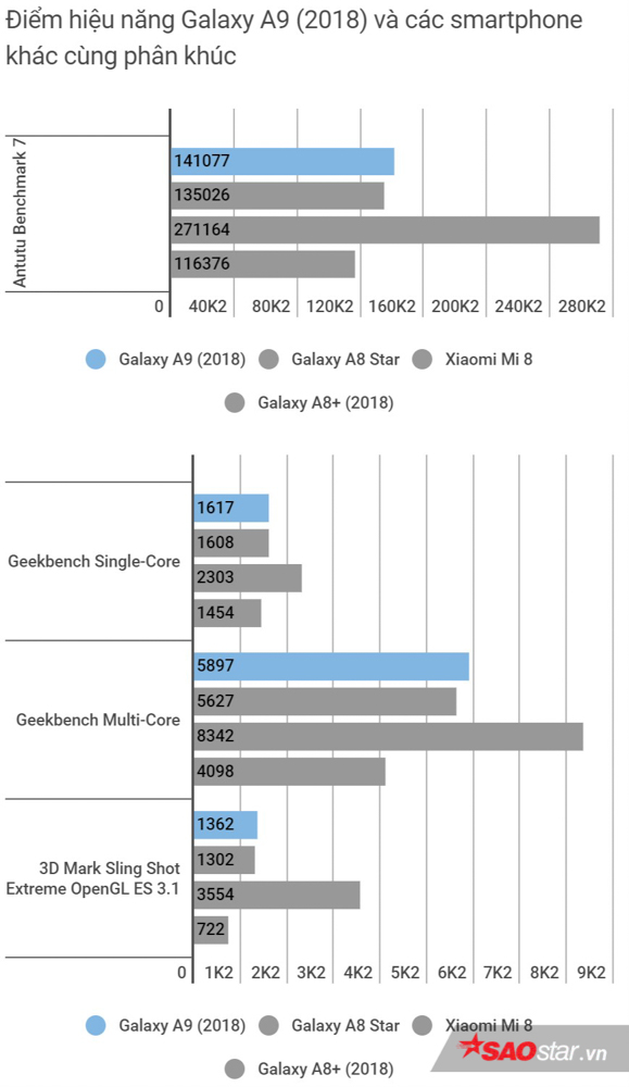 Galaxy A9 (2018) được trang bị vi xử lý Snapdragon 660 tám nhân, 6 GB RAM, 128 GB bộ nhớ trong có hỗ trợ thẻ nhớ gắn ngoài. Cấu hình này có thể không ấn tượng như một số sản phẩm khác cùng phân khúc nhưng nó đủ để bạn thoải mái dùng mượt mà các ứng dụng quen thuộc hằng ngày.