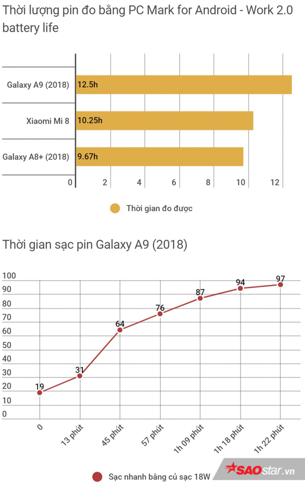 Để dùng hết viên pin dung lượng 3.800 mAh của Galaxy A9 (2018) trong một ngày đòi hỏi bạn dùng “khắc nghiệt” một chút như dùng cả 2 SIM, luôn bật 4G, wifi, bluetooth, GPS và cùng chinh chiến game với lũ bạn những lúc rảnh rỗi. Còn dùng nhẹ nhàng lướt web, check face, dùng wifi nơi văn phòng, quán xá thì 2 ngày mới cần sạc là điều hoàn toàn có thể với “em dế” này đấy.
