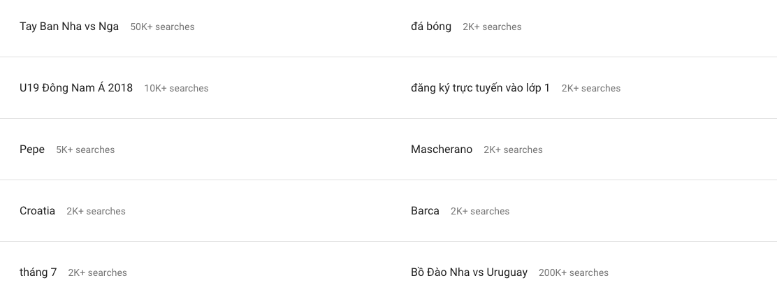 Ghi nhận trong khoảng 3 giờ trước giờ diễn ra trận đấu vòng 1/16 thứ ba giữa đội tuyển Tây Ban Nha và đội tuyển Nga, từ khoá liên quan đến trận đấu này đang được người dùng Việt Nam tìm kiếm nhiều nhất trên Google. Lượng tìm kiếm từ khoá “Tây Ban Nha vs Nga” được Google thống kê ở mức trên 50.000 lần và bất ngờ đạt đỉnh vào rạng sáng hôm qua, ở thời điểm trận đấu giữa Bồ Đào Nha và Uruguay kết thúc.