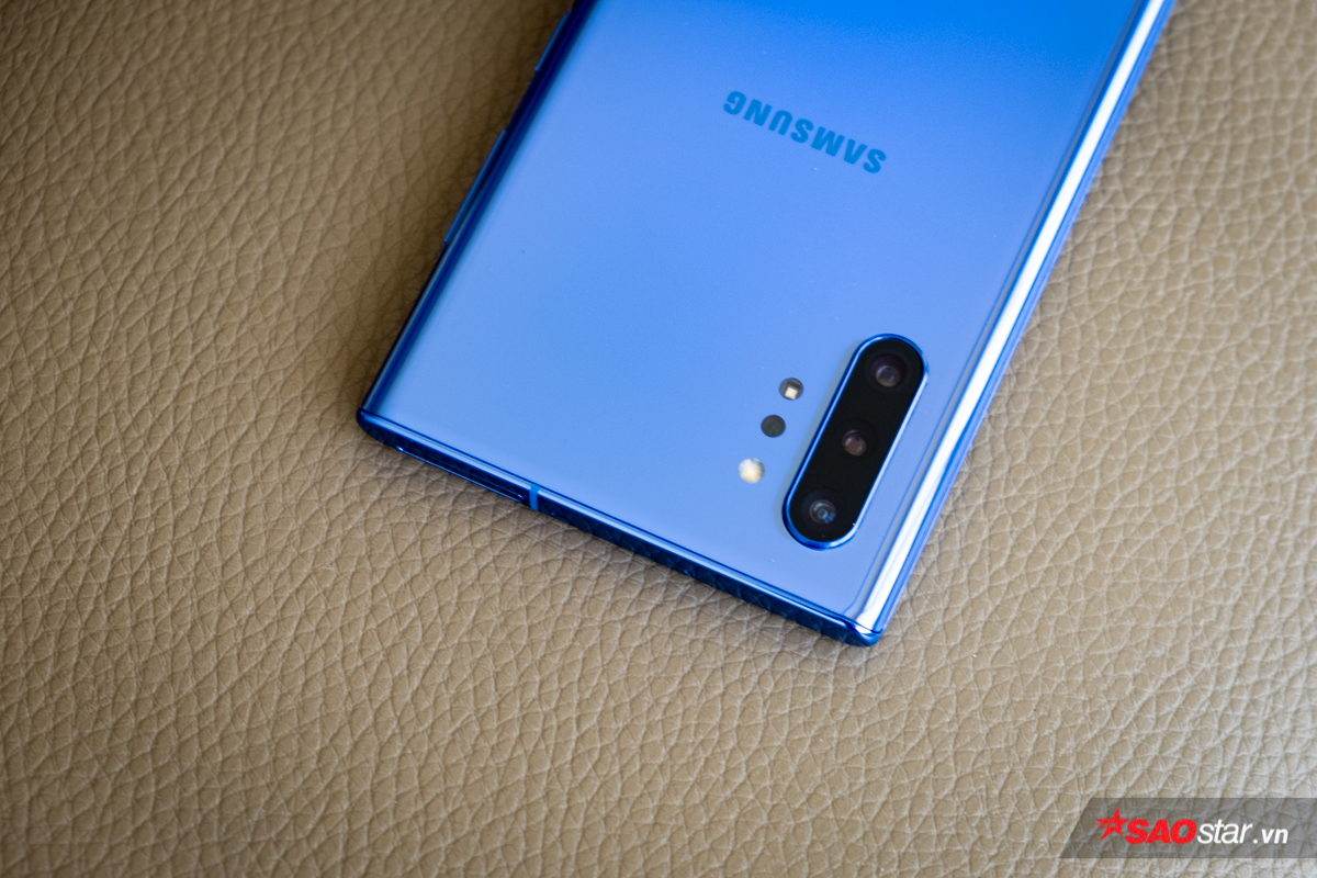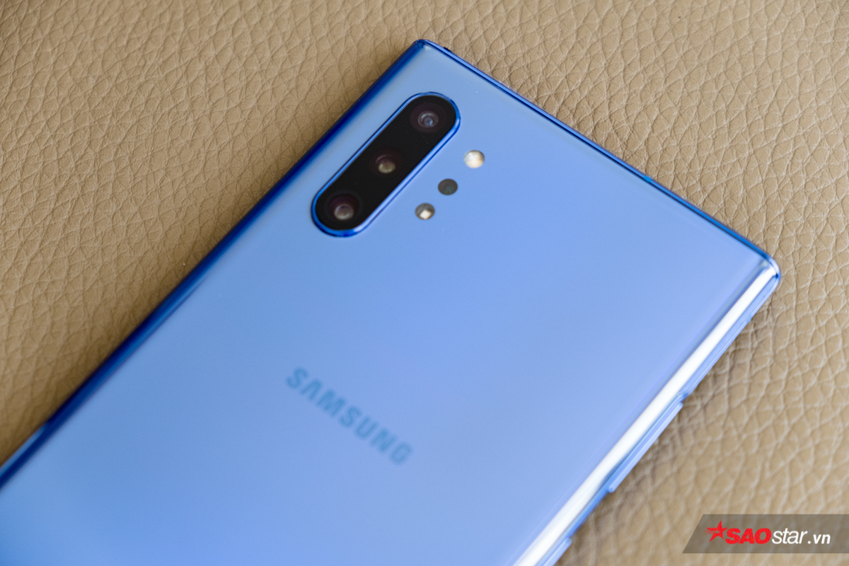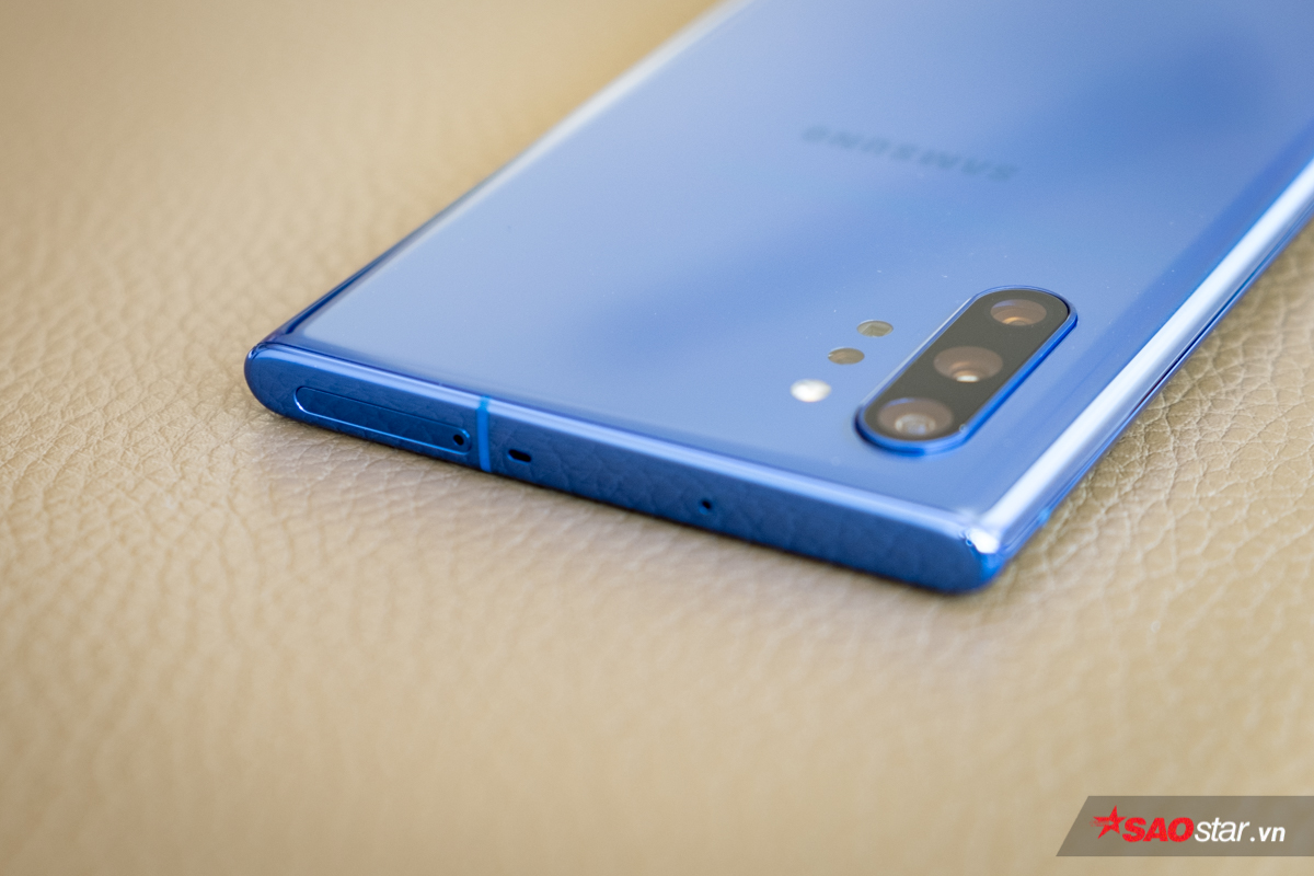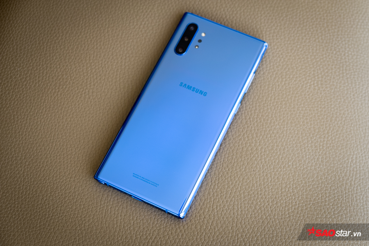 Màu sắc Xanh Aura mà Samsung phủ lên chiếc Note10+ có thể phản chiếu lại ánh sáng, và mang đến một dãy đầy đủ các sắc xanh tuỳ vào độ nghiêng và mức độ ánh sáng chiếu vào thiết bị.
