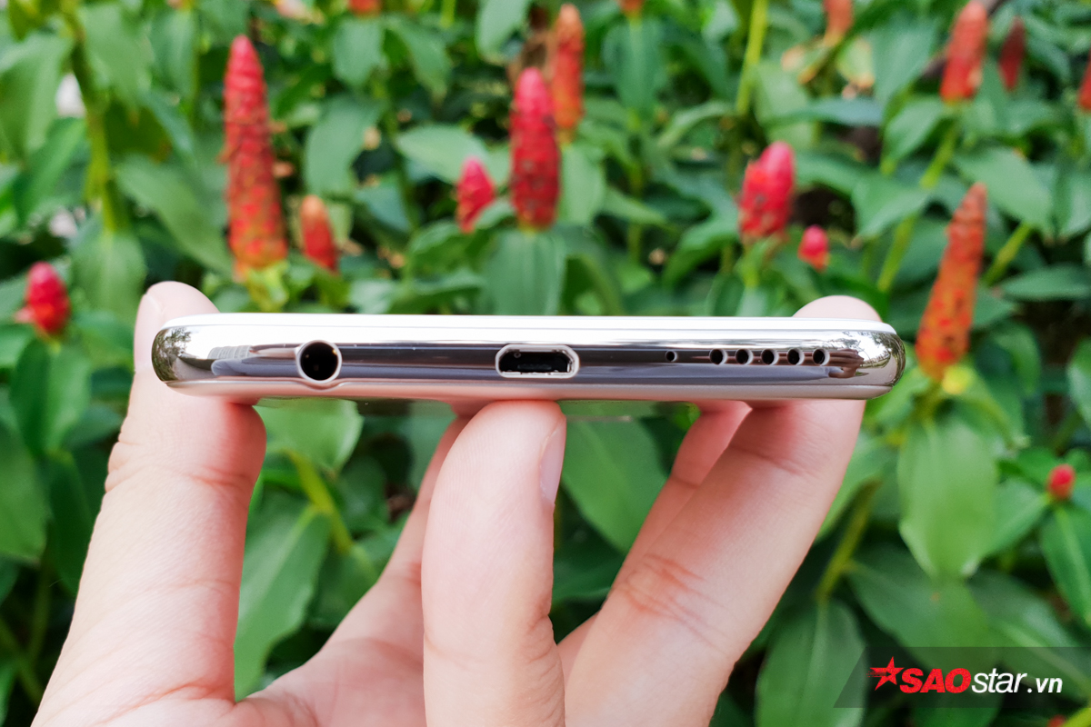 Ở đuôi máy, jack cắm tai nghe 3,5 mm, cổng sạc micro-USB và lỗ loa được bố trí.