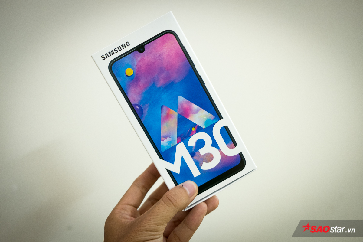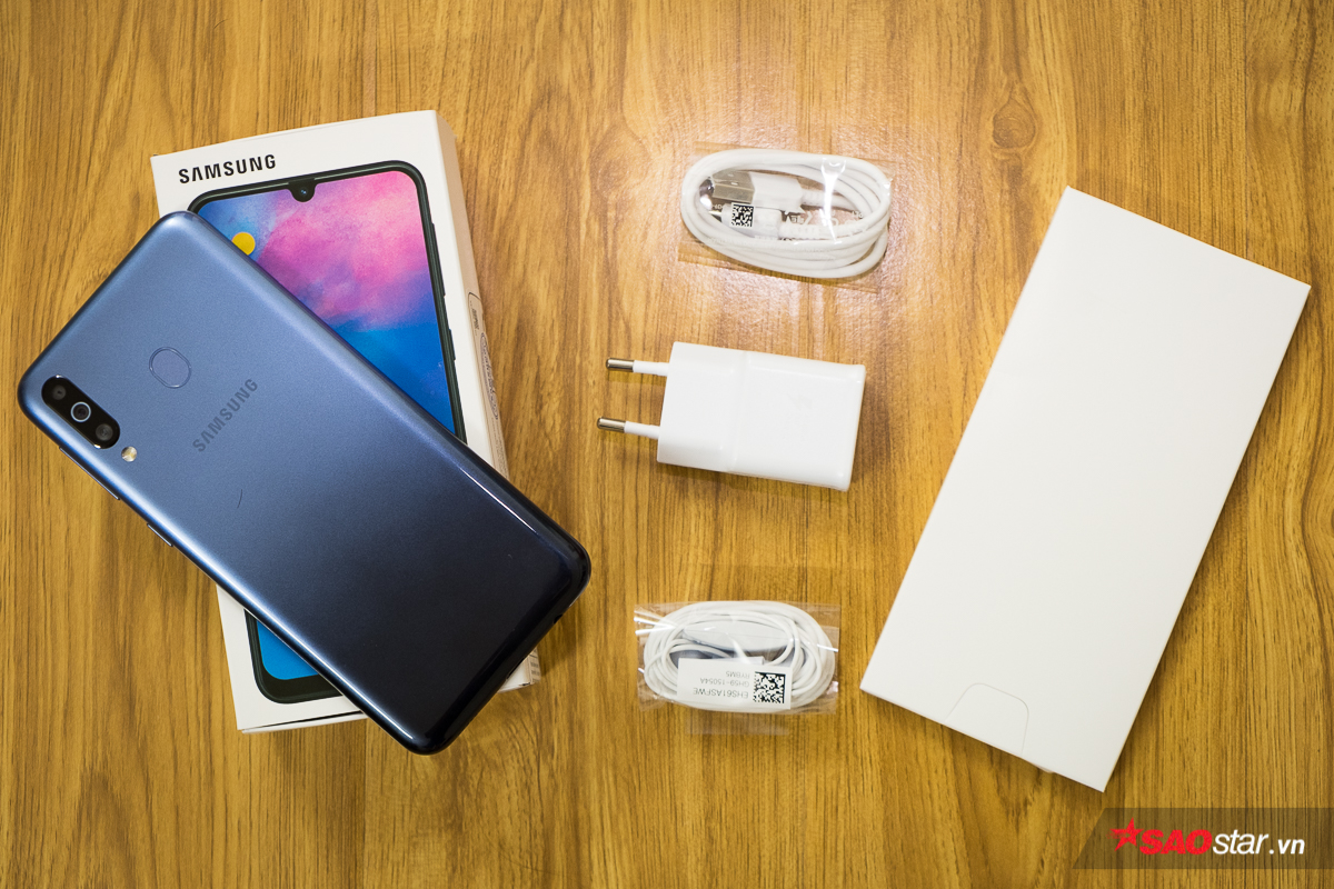 Bên trong hộp máy, ngoài chiếc Samsung Galaxy M30, người dùng còn có thêm sách dẫn sử dụng, tai nghe, cáp sạc và cục sạc.