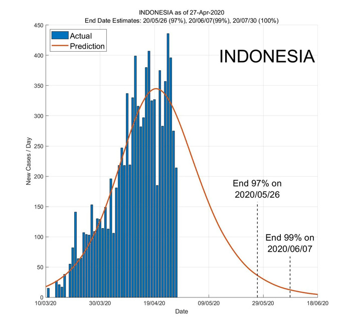 AI dự đoán dịch bệnh Covid-19 có khả năng gần hết đến 97% tại Indonesia vào ngày 26/5. Đến ngày 7/6, tình hình sẽ được cải thiện đến 99% và dứt điểm hoàn toàn 100% vào ngày 30/7.