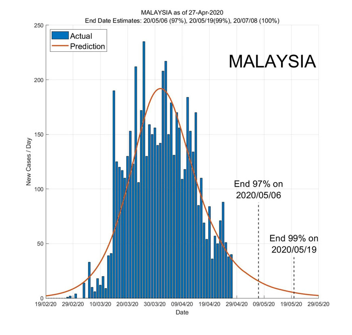 AI dự đoán dịch bệnh Covid-19 có khả năng gần hết đến 97% tại Malaysia vào ngày 6/5. Đến ngày 19/5, tình hình sẽ được cải thiện đến 99% và dứt điểm hoàn toàn 100% vào ngày 8/7.