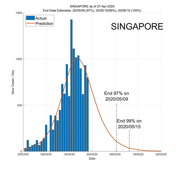 Theo dự đoán của AI, dịch bệnh Covid-19 có khả năng gần hết đến 97% tại Singapore vào ngày 9/5. Đến ngày 15/5, tình hình sẽ được cải thiện đến 99% và dứt điểm hoàn toàn 100% vào ngày 10/6.