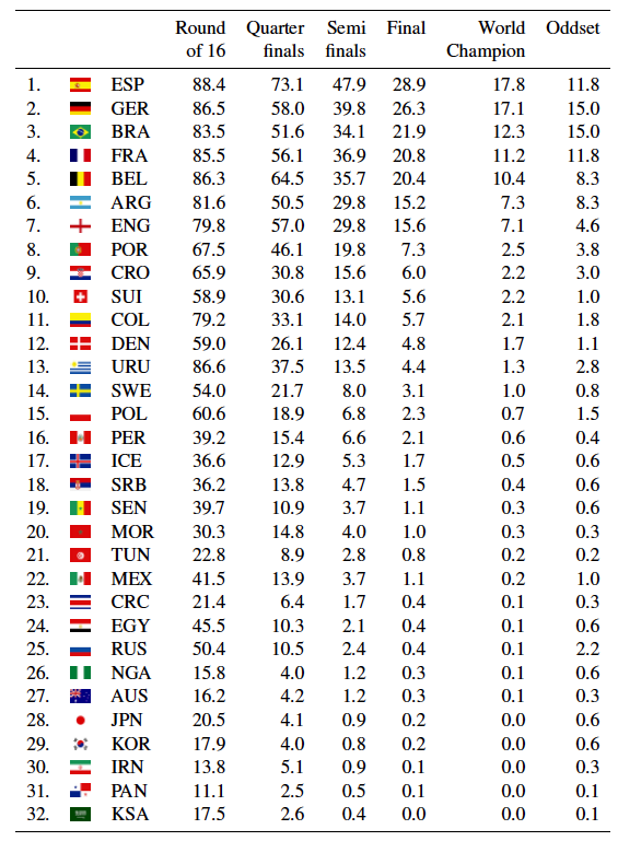Trong bảng kết quả dự đoán cuối cùng được nhóm nghiên cứu đưa ra, trs tuệ nhân tạo và thống kê cho thấy Tây Ban Nha và Đức là hai đội bóng có nhiều khả năng vô địch World Cup 2018 nhất. Tuy nhiên, thực tế cho thấy điều này sẽ không xảy ra bởi Đức đã không thể vượt qua vòng bảng sau trận thua sốc 0-2 trước đội tuyển Hàn Quốc, còn Tây Ban Nha cũng gục ngã trước những chú gấu Nga sau loạt sút penalty cân não.