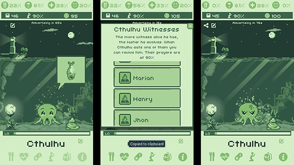 Nhắc đến những tựa game thú ảo hay nhất thì không thể không nhắc đến Cthulhu. Khi chú bạch tuộc ảo tỉnh giấc, nhiệm vụ của bạn là chăm sóc thật tốt chú ấy bằng cách cho ăn, kiểm tra sức khỏe định kì cũng như cho chú ấy chơi những tựa mini-game có sẵn.