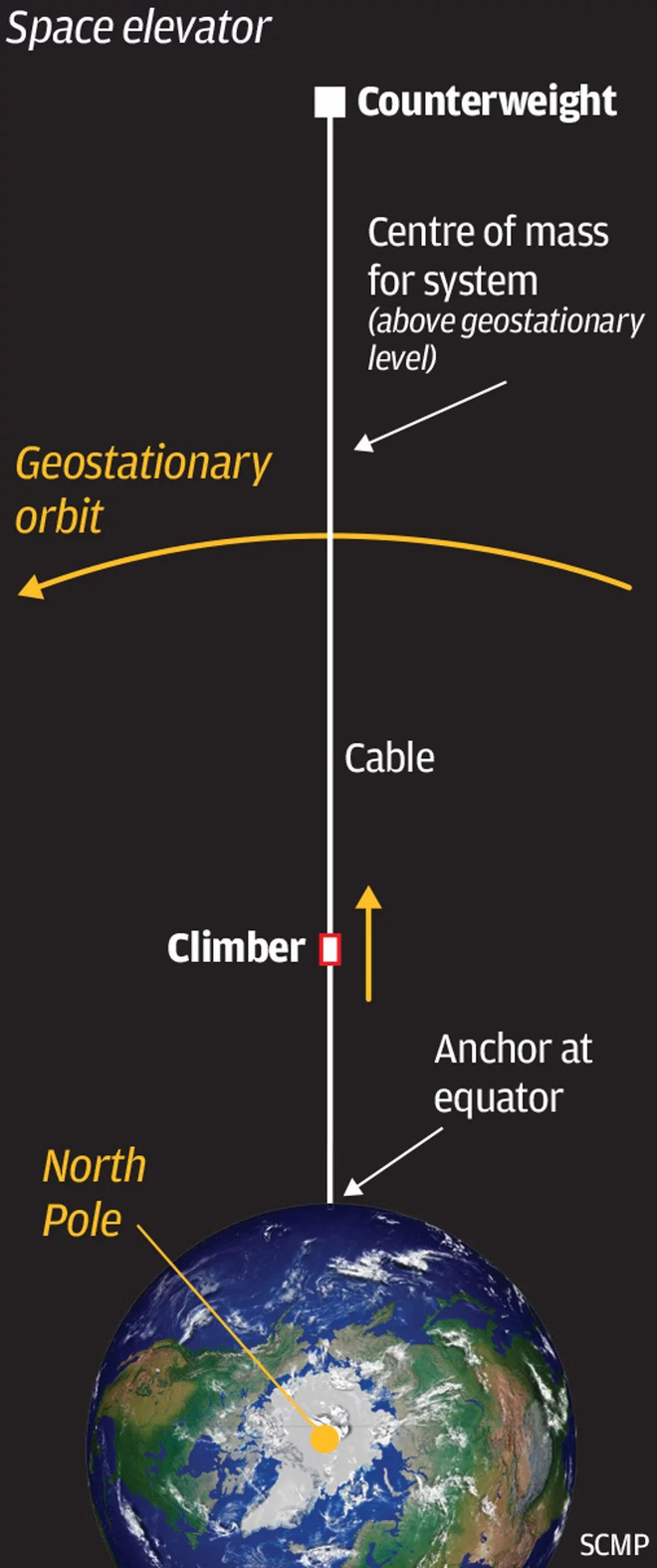 Hệ thống này yêu cầu phải có chiều dài tầm 36.000km (gấp ba lần đường kính Trái Đất) để đáp ứng được nhu cầu khi kéo căng, thẳng đứng bởi lực hấp dẫn và lực ly tâm. Kế đó, một chiếc xe có thể đi dọc theo cáp, được đẩy bởi năng lượng quay của Trái Đất.