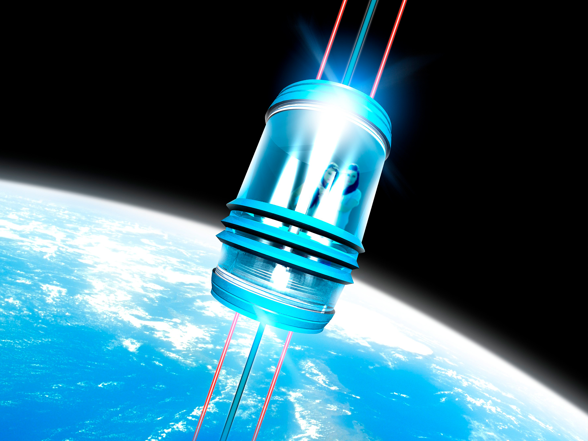 Về lý thuyết, thang máy vũ trụ là hệ thống bao gồm một cáp neo vào bề mặt Trái đất và gắn liền với một đối trọng được gửi vào không gian.