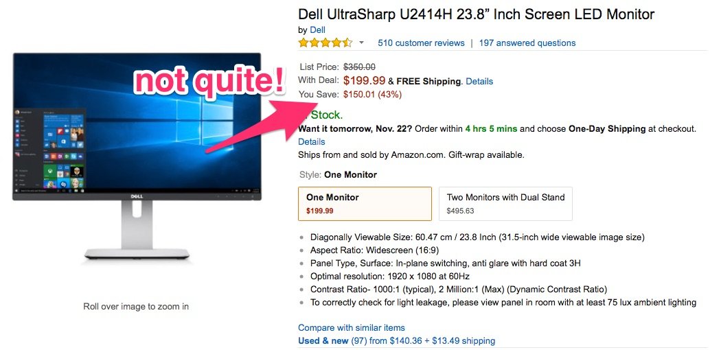 Ví dụ: Amazon hiện đang có giá cực hời khi mua màn hình Dell: chiếc màn hình được bán với giá $199, tiết kiệm tới $150 (43%).