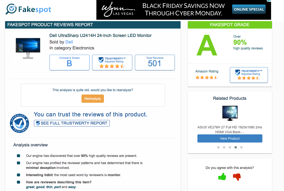 Như deal màn hình chúng ta nêu trên, khi dán vào Fakespot, ta sẽ nhận lại được đánh giá mức A. Mức độ tin cậy sẽ giảm dần, từ A, B, C, D và F, tức là ta có thể tin tưởng mặt hàng định mua là hàng thật, không bị lừa.