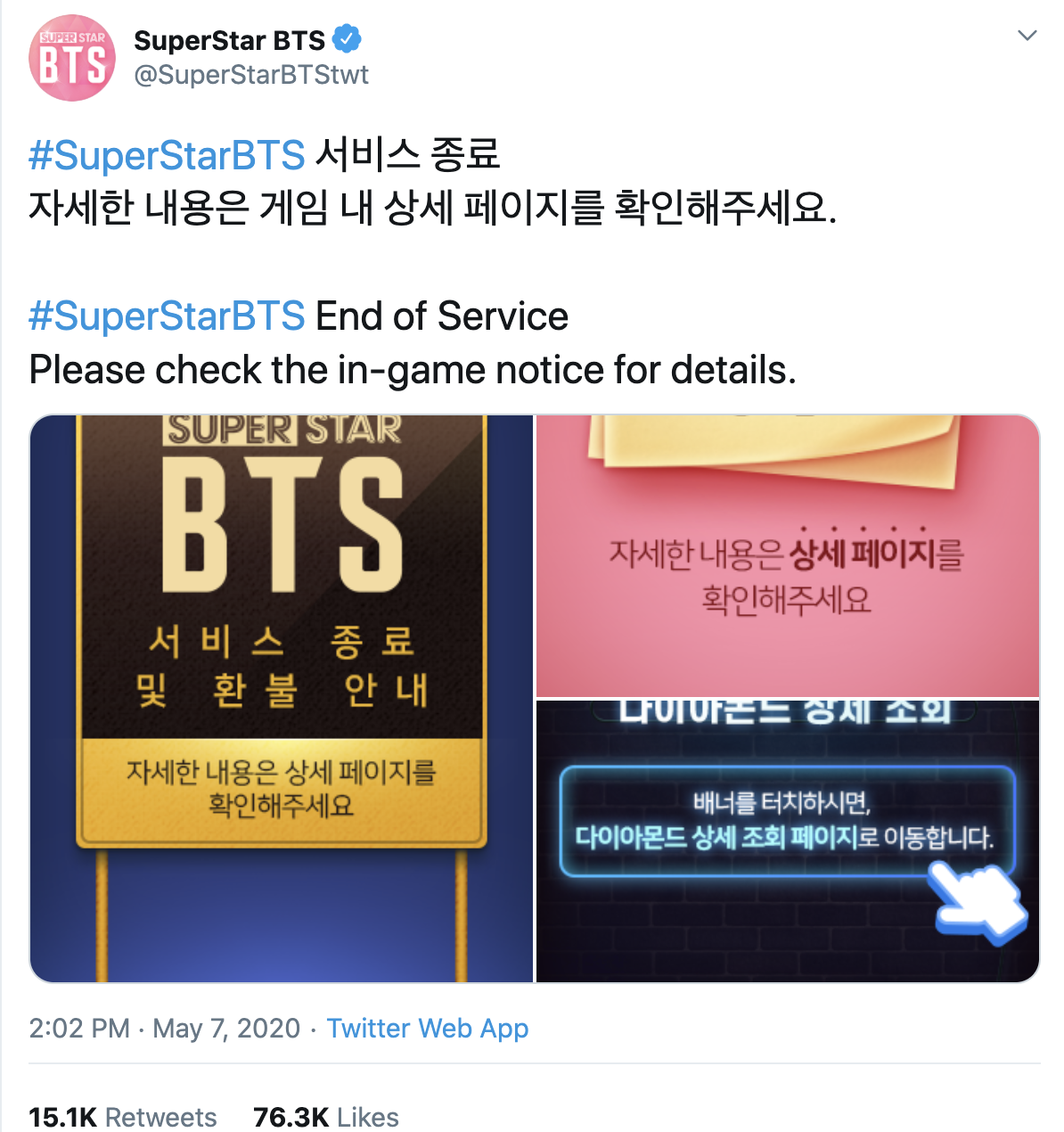“SuperStar BTS sẽ kết chính thức ngưng hoạt động vào ngày 23/6 tới”, nội dung thông báo cho biết.