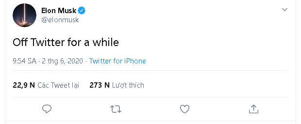 Thế nhưng đến hôm sau, ông đã thông báo ngắn gọn rằng “Off Twitter for a while” (tạm dịch là Tắt Twitter một thời gian) mà không để lại thêm lời giải thích nào. Tuyên bố “nghỉ chơi” mạng xã hội của Musk sau đó đã được đông đảo người dùng quan tâm.