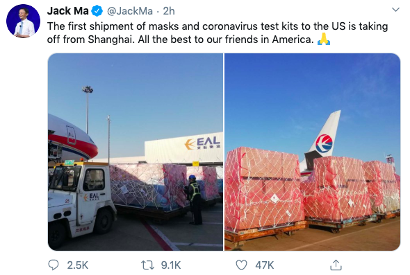 Mới đây, tỷ phú Trung Quốc Jack Ma đã lần đầu gia nhập mạng xã hội Twitter. Trong bài đăng đầu tuên của mình, nhà sáng lập Alibaba đã đăng hình ảnh một chiếc máy bay của hãng hàng không China Eastern Airlines với rất nhiều hộp bộ kit xét nghiệm virus corona chủng mới cùng khẩu trang sẵn sàng chuyển sang Mỹ từ Thượng Hải, theo Bloomberg.