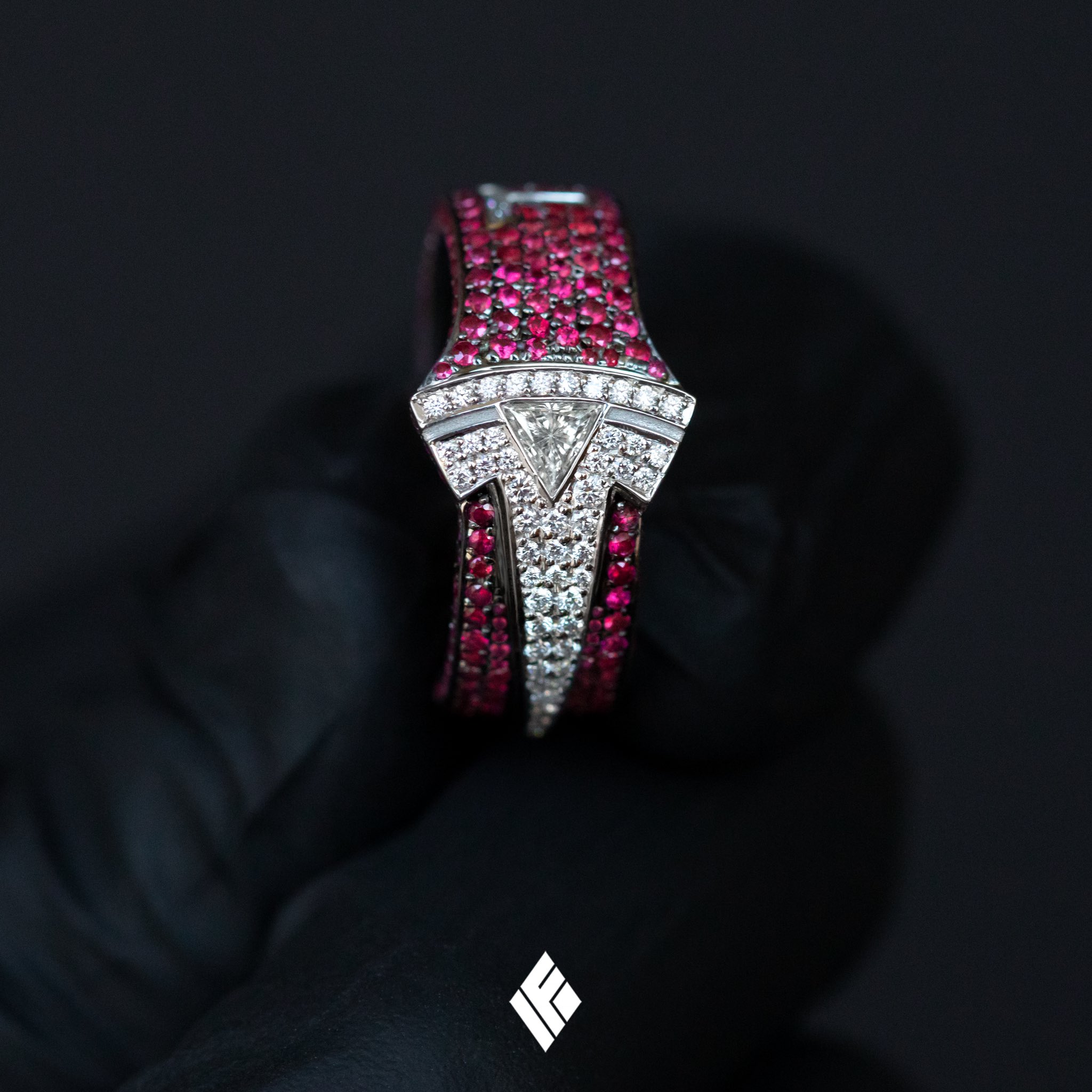 Được biết, chiếc nhẫn được làm từ bạch kim, với mặt nhẫn phủ những hạt kim cương và ruby “hạng nhất” này có giá lên tới 40.000 USD (hơn 930 triệu đồng). Nổi bật giữa những viên ruby đỏ là phần logo chữ “T” bằng kim cương trắng, mặt sau là chữ “TESLA” được ghép từ những kim cương chữ nhật.