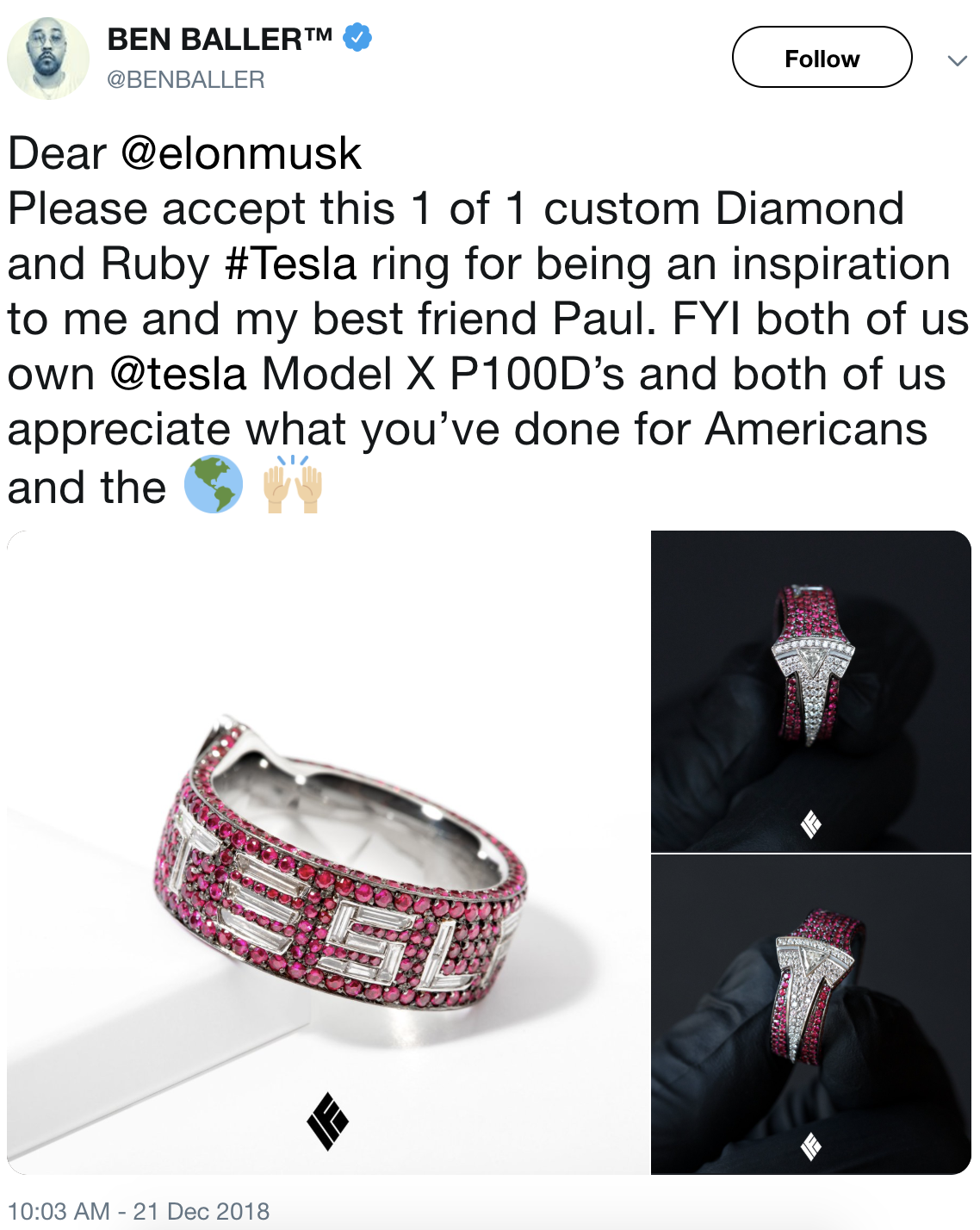 “Cảm ơn Musk vì đã truyền cảm hứng cho tôi và Paul, người bạn thân nhất của tôi. Do đó, xin hãy nhận chiếc nhẫn Tesla độc nhất vô nhị làm từ kim cương và ruby này”, Ben Baller chia sẻ.