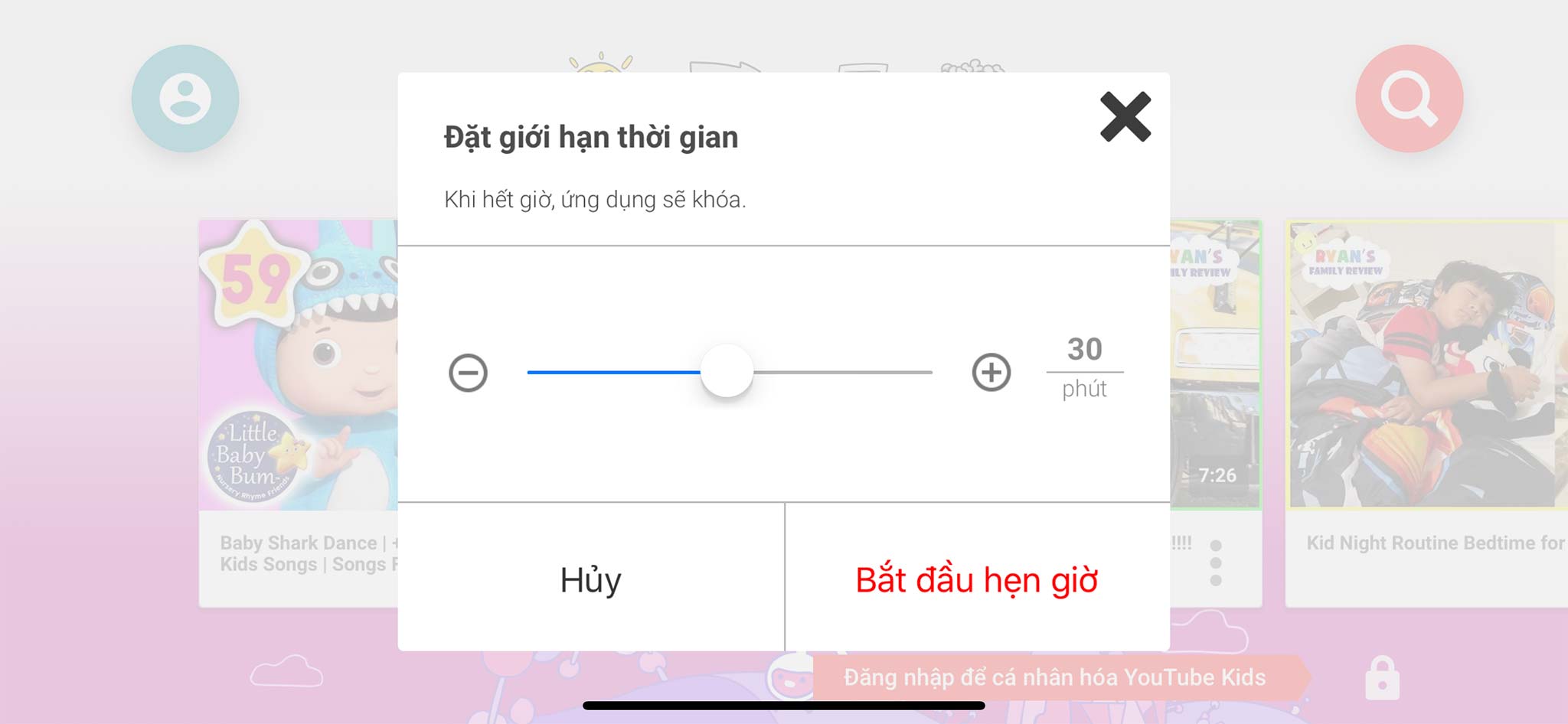 Ngoài ra, phụ huynh cũng có thể thiết lập thời gian cho phép bé xem Youtube Kids trong khoản thời gian nhất định với tính năng hẹn giờ. Khi đến thời gian quy định, ứng dụng sẽ tự động kích hoạt chức năng khóa màn hình của máy.