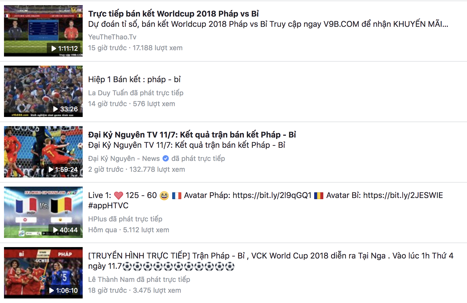 Trận bán kết giữa Pháp - Bỉ bị phát lậu bởi người sử dụng Facebook tại Việt Nam.