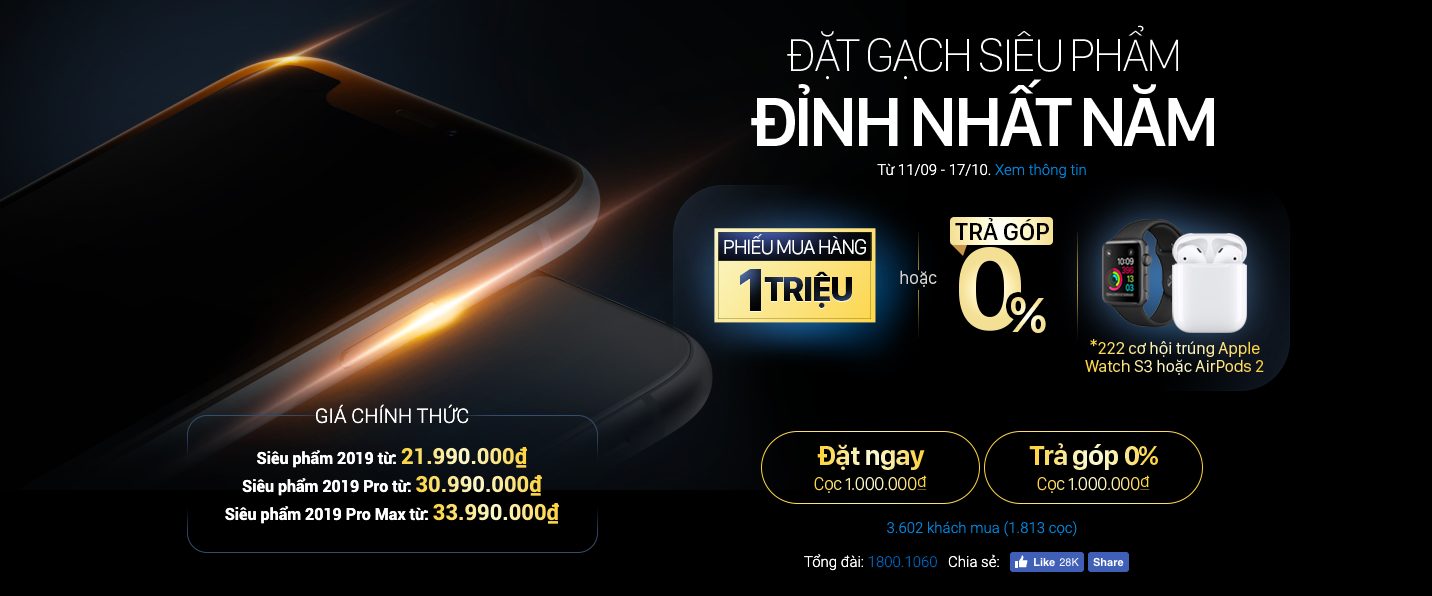 Mặc dù iPhone là chiếc điện thoại quan trọng và các sự kiện mở bán của nó thường được quảng bá mạnh mẽ, ở thời điểm hiện tại, chương trình đặt trước iPhone mới được hiển thị một cách khá khiêm tốn trên website của một hệ thống bán lẻ lớn cùng dòng thông điệp “đặt gạch siêu phẩm đỉnh nhất trong năm” thay vì trực tiếp nhắc đến những cái tên như iPhone 11, iPhone 11 Pro hay iPhone 11 Pro Max.