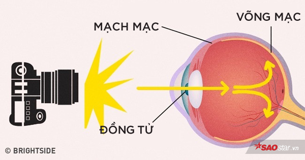 Màu đỏ này theo đó đến từ sáng được phản chiếu lại từ võng mạc trong mắt của chúng ta. Ở những loại động vật, bao gồm chó, mèo hay hươu, võng mạc có một lớp phản chiếu đặc biệt có tên gọi tapetum lucidum. Hình dung một cách đơn giản, lớp phản chiếu này cũng giống như một tấm gương đặt ở phía sau mắt vậy. Nếu bạn chiếu đèn flash vào mắt của những loài này vào ban đêm, mắt chúng sẽ phản chiếu lại một màu trắng, sáng. Tuy nhiên, mắt con người lại không có lớp phản chiều này.