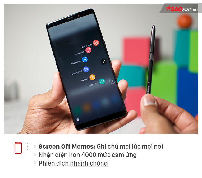 Tính năng Screen Off Memos đã làm mưa làm gió trong lòng fan hâm mộ dòng Note và điều đó quả không sai. Chẳng cần phải bật màn hình rồi mở khóa mỗi khi có chuyện gấp đột xuất, bạn chỉ cần sử dụng cây bút S Pen đi kèm và thao tác luôn trên mặt viết. Mọi dòng ghi chú và thông tin sẽ được lưu lại ngay lập tức. Những vai trò khác như dịch thuật, cảm ứng nhận diện lực… cũng chỉ mới xuất hiện trên Note 8 nhờ vào S Pen mà thôi.