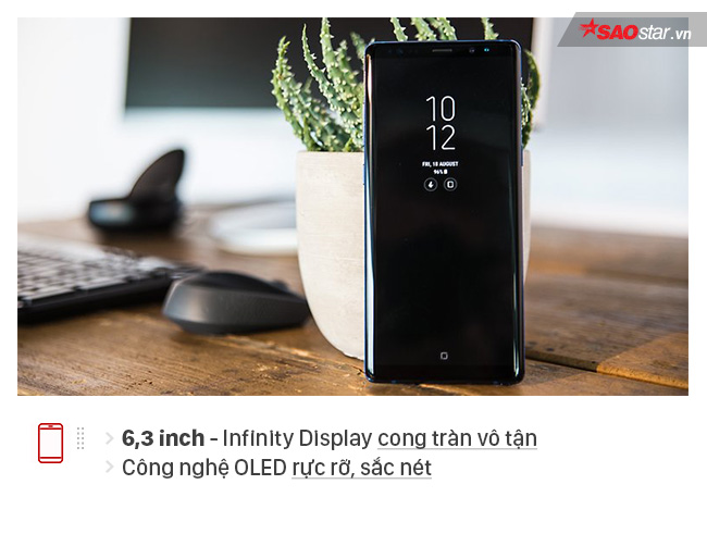 Kích cỡ màn hình của Galaxy Note 8 lên tới 6,3 inch, thiết kế Infinity Dipslay cong tràn cạnh được tối giản viền. Chất lượng màn hình về cả phần cứng lẫn phần mềm của Note 8 được đánh giá là tốt nhất trên thị trường hiện tại, điều đó cũng đến một phần nhờ Samsung còn làm chủ chuỗi cung ứng công nghệ OLED lớn bậc nhất làng smartphone.