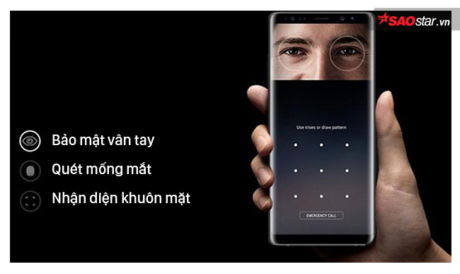 Số lượng hình thức bảo mật an ninh dữ liệu cá nhân trên Galaxy Note 8 là cực phong phú, bao gồm nhận diện khuôn mặt, quét mống mắt, quét vân tay, mã PIN, mật khẩu. Đây sẽ là yếu tố giúp bảo toàn nguyên vẹn mọi thông tin quan trọng trong máy, không lo có bất cứ vấn đề bất trắc nào nếu có sự cố xảy ra.