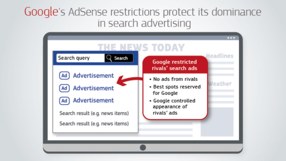 Nhóm của bà Vestager đã kết luận rằng các website bên thứ ba - ví dụ như báo chí hay các website du lịch - sử dụng Google để vận hành chức năng tìm kiếm và quảng cáo có “những điều khoản hạn chế trong hợp đồng” ngăn họ chạy quảng cáo từ những công cụ tìm kiếm khác, theo Business Insider. Được biết, uỷ ban nói trên đã xem xét hàng trăm hợp đồng từ năm 2006 cho tới nay có điều khoản nói trên. Google trong khi đó khẳng định hãng này đã loại bỏ các điều khoản độc quyền từ năm 2009 và thay thế vào đó bằng điều khoản “đặt quảng cáo ưu tiên,” trong đó dành các vị trí mang lại nhiều lợi nhuận nhất trên trang cho các quảng cáo Google.