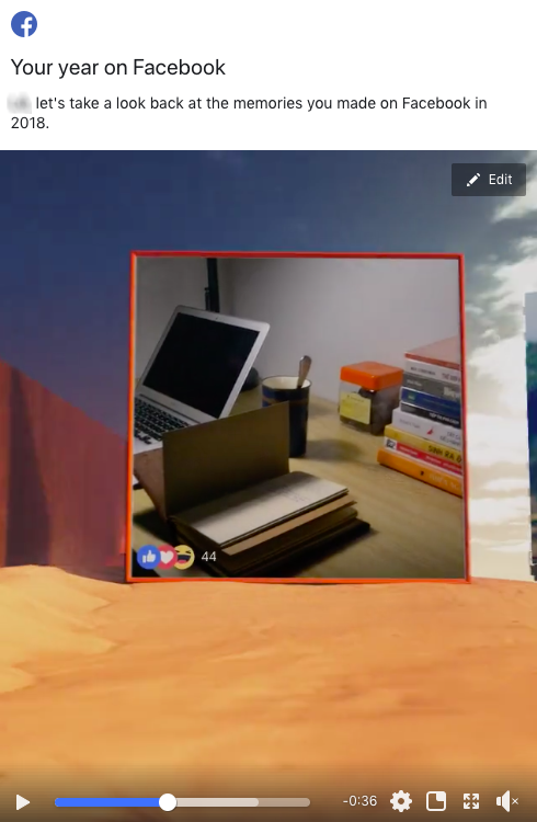 Theo đó, khi click vào tab này, người dùng sẽ thấy một đoạn video được Facebook tạo ra sẵn. Khi xuất hiện ở tab này, video sẽ ở dạng chỉ riêng mình bạn nhìn thấy, trừ khi nó được chia sẻ. Dù vậy, bạn hoàn toàn có thể tuỳ biến lại những hình ảnh sẽ xuất hiện trong đoạn video của mình bằng cách click vào nút Edit ở góc trên bên phải video. Tại màn hình tiếp theo, bạn có thể tuỳ ý lựa chọn hình ảnh sẽ xuất hiện trong mỗi khung hình.