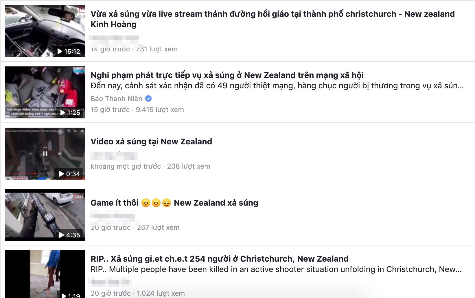 Theo tìm hiểu, nhiều chủ kênh của Việt Nam đã nhanh chóng đăng tải lại đoạn video này với tựa đề gây sốc như “Vụ xả súng 40 người chết sáng nay tại New Zealand. Thật kinh khủng! Cân nhắc trước khi xem”, “RIP xả súng giết chết 254 người tại thành phố Christchurch, New Zealand”,… Điều đáng nói, không như các kênh chính thống đã loại đi nhiều các phân cảnh bạo lực máu me, những video kể trên được đăng tải lại hoàn toàn tội ác khủng khiếp của video gốc. Những video tương tự cũng được tìm thấy trên YouTube và Twitter.