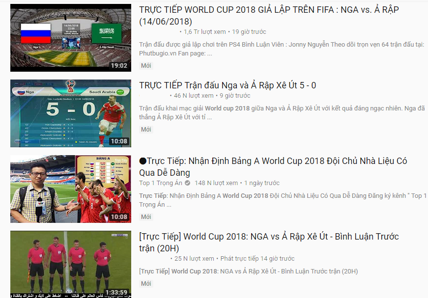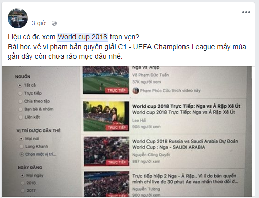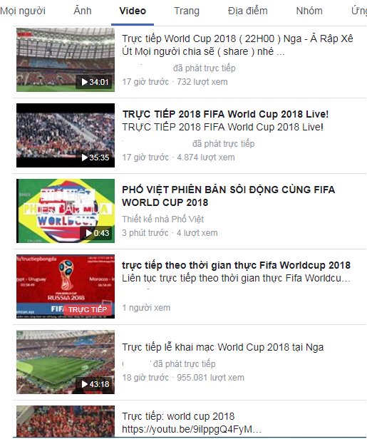 Trong trận khai mạc World Cup 2018 giữa Nga và Saudi Arabia, chỉ với và từ khóa liên quan, người dùng Facebook có thể tìm thấy hàng trăm tài khoản cá nhân hay các Fanpage tại Việt Nam đã thực hiện vệc livestream trái phép trận đấu.
