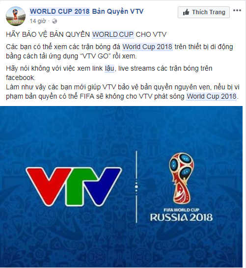 Mặc dù, trước hôm diễn ra khai mạc World Cup 2018, VTV đã phát đi cảnh báo đối với những trường hợp vi phạm bản quyền dưới bất kỳ hình thức nào sẽ phải chịu trách nhiệm trước pháp luật về mọi tổn thất phát sinh cho VTV và Liên đoàn bóng đá thế giới FIFA, trong suốt quá trình trận đối đầu giữa chủ nhà Nga và Saudi Arabia diễn ra hôm 14/6, tình trạng livestream trái phép vẫn tiếp diễn tràn lan trên Facebook và YouTube.