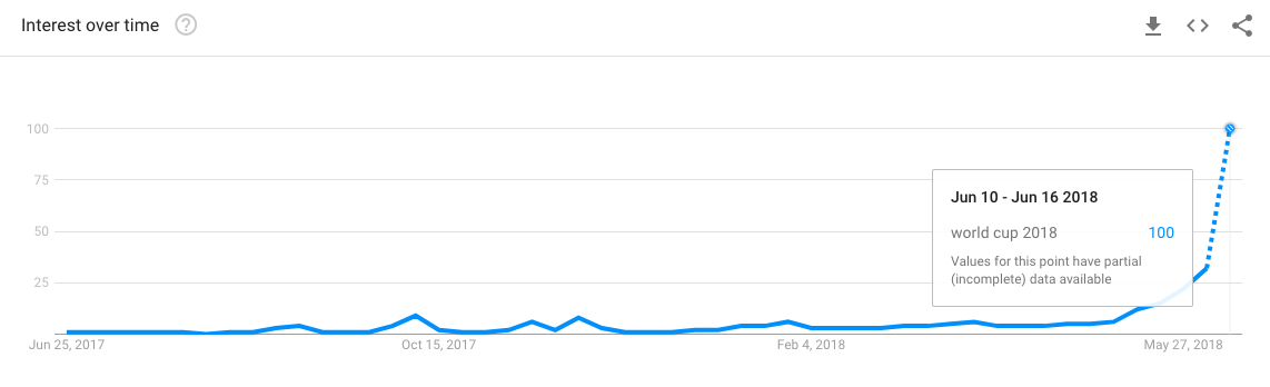 Thời điểm trái bóng Telstar 18 lăn trên đất Nga, chính thức đánh dấu sự khởi tranh của World Cup 2018, lượng tìm kiếm từ khoá “World Cup 2018” cũng tăng vọt trên Google. Theo ghi nhận của công cụ theo dõi xu hướng tìm kiếm Google Trends, từ khoá “World Cup” dường như tăng trưởng với tốc độ thẳng đứng kể từ thời điểm đầu tháng 6.