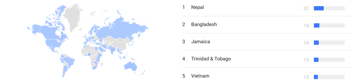Cũng theo Google Trends, Nepal là nước quan tâm đến World Cup 2018 nhất trên Google với “điểm tìm kiếm” 32. Bangladesh, Jamaica và Trinidar & Tobago đứng ở các vị trí tiếp theo với điểm số lần lượt là 18, 16 và 15. Việt Nam hiện tại xếp ở vị trí thứ 5 trong top những quốc gia tìm kiếm nhiều nhất về World Cup 2018 với điểm tìm kiếm 13.