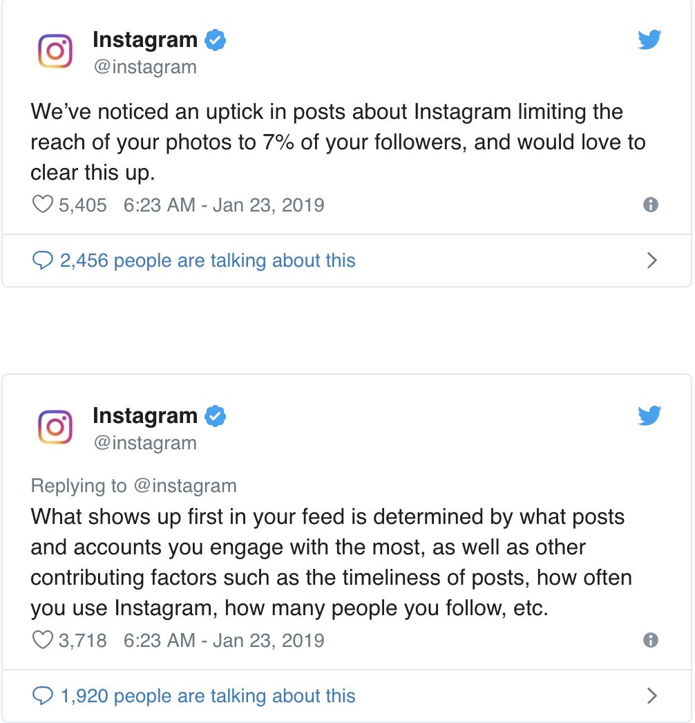 “Chúng tôi nhận thấy có nhiều người đang lan truyền những thông tin vô cắn cứ cho rằng Instagram giới hạn hiển thị bài đăng. Tuy nhiên, chúng tôi muốn nói rõ rằng đó không phải là sự thật. Chúng tôi không thực hiện bất kì thay đổi nào trong việc hiển thị bài đăng, và chúng tôi không che giấu bất kỳ bài viết từ những người bạn đang theo dõi.
