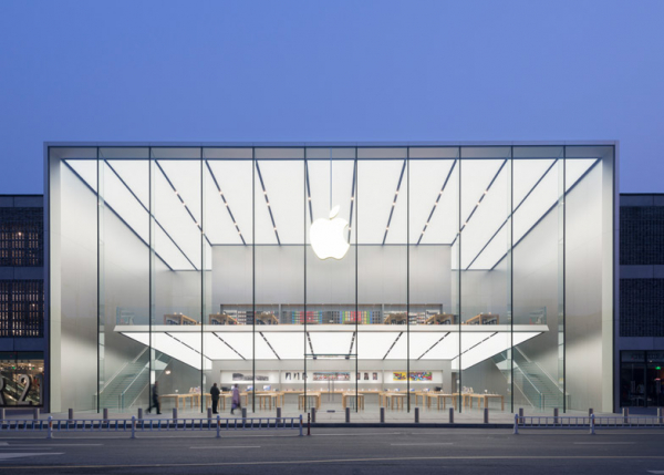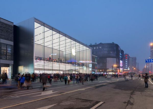 Tương tự nhiều cửa hàng Apple Store khác, cửa hàng Apple Store tại Trung Quốc cũng sử dụng rất nhiều chất liệu kính bởi nó là đặc trưng cho thiết kế tối giản và trong suốt mà Apple theo đuổi. Ban ngày, ánh sáng tự nhiên đi vào cửa hàng thông qua những tấm kính lớn trong khi đó vào ban đêm ánh sáng được chiếu xuống từ trần nhà màu trắng tạo ra không gian ấn tượng.