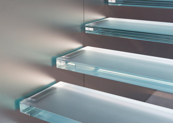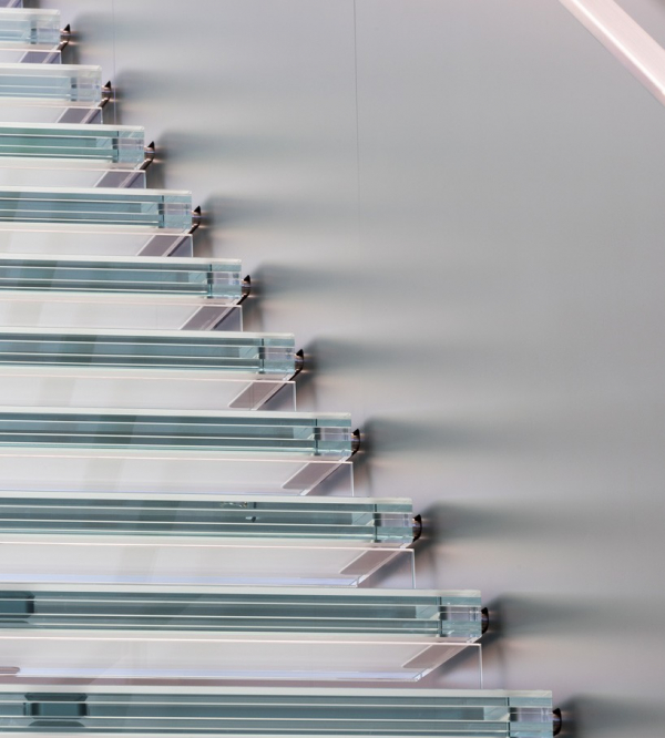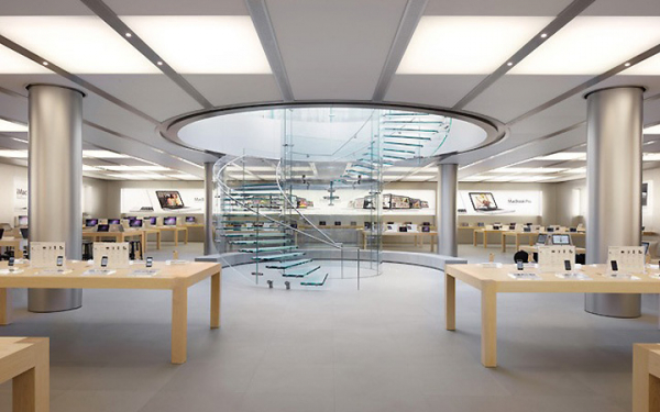 Nẳm ở trung tâm cửa hàng, cầu thang này bao quanh một cột trụ lớn với nguồn sáng được chiếu thẳng từ trên xuống tạo ra hiệu ứng thú vị. Không gian của cửa hàng này rất mở và thoáng đãng. Apple còn khéo léo xây dựng nhiều ban công hành lang ở tầng trên để khách tới thăm có thể nhìn toàn cảnh thiết kế cửa hàng. Phần lan can của ban công được nhấn nhá bằng chất liệu sắt, có vẻ khá đối lập với chất liệu kính của cầu thang và màu trắng chủ đạo của cửa hàng.