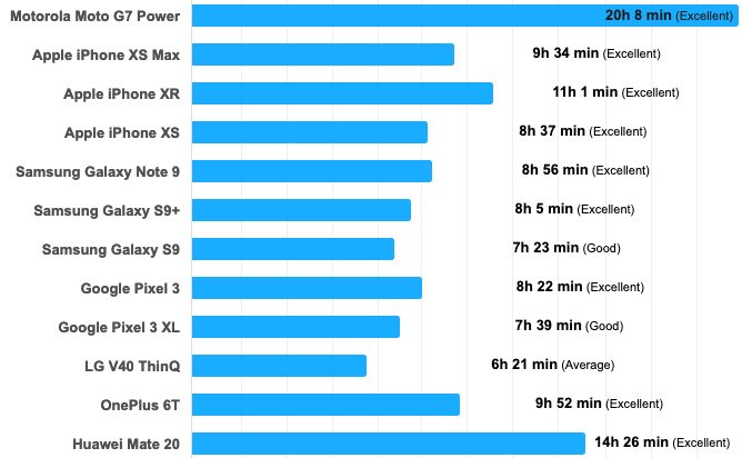 Cụ thể, trong bài kiểm tra thời lượng pin của Phonearena, Moto G7 Power đạt thành tích ấn tượng ở mức 20 giờ 8 phút. So với một số điện thoại cao cấp khác đang được bán ra ở thời điểm hiện tại, con số mà Moto G7 Power tỏ ra vượt trội hơn rất nhiều. Ví dụ, Phonearena đo được iPhone Xs Max đạt thời lượng sử dụng 9 giờ 34 phút trong một lần sạc còn thành tích của Samsung Galaxy Note9 là 8 giờ 56 phút. Được biết, để đưa ra được kết quả này, Phonearena đã cho các thiết bị chạy một đoạn mã web tuỳ biến mô phỏng mức tiêu thụ năng lượng thường thấy của người dùng với độ sáng màn hình ở mức 200 nits.