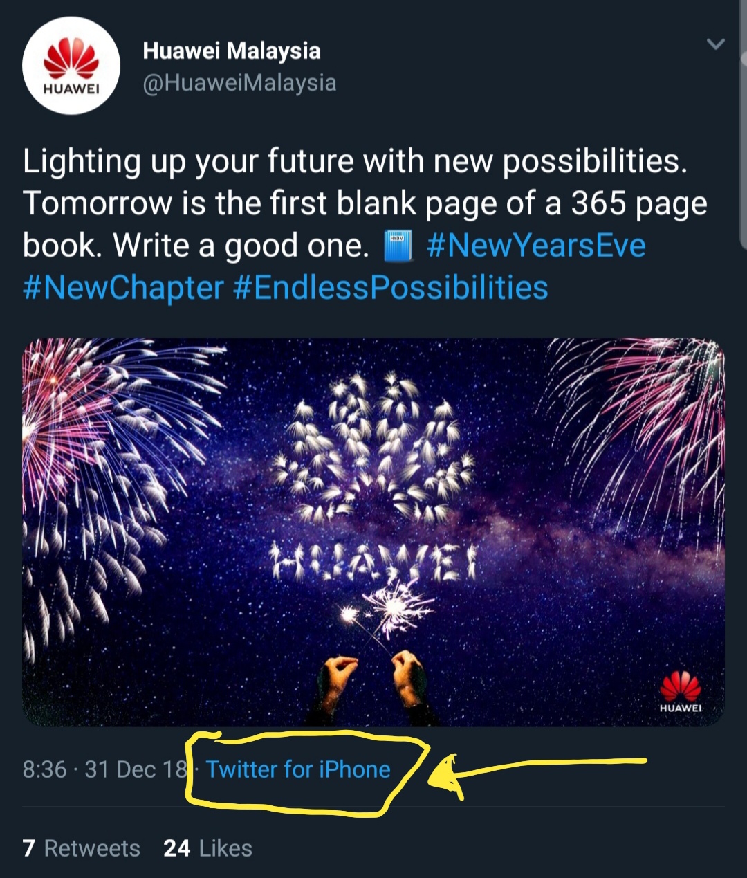 Vừa bước vào năm mới 2019, Huawei đã vấp phải một sai lầm “muối mặt”. Theo đó, để chào mừng năm mới 2019, Huawei đã đăng một dòng tweet lên Twitter chính thức của mình cùng nội dung: “Chúc mừng 2019 từ tất cả chúng tôi tại Huawei. Mục tiêu của chúng tôi trong năm mới là mang đến cho bạn những lý do để kết nối đến những gì bạn quan tâm.” Sẽ chẳng có gì đáng nói nếu như bài đăng này không được thực hiện bằng… iPhone.