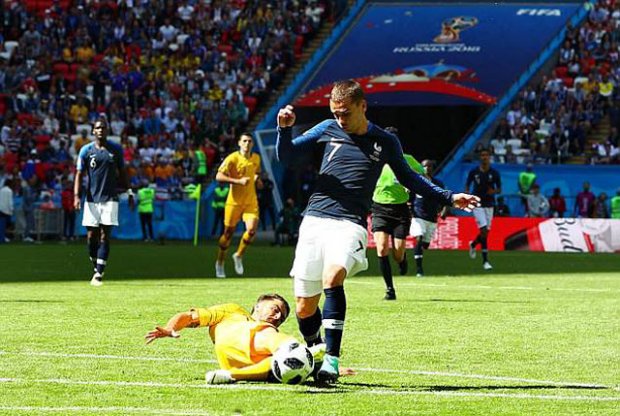 Phút thứ 54 của trận đấu, tiền đạo Antoine Griezmann gã trong khu vực penalty sau một pha bóng được cho là có va chạm với hậu vệ Australia Joshua Risdon. Kylian Mbappé, cầu thủ 19 tuổi của đội tuyển Pháp, chỉ hai tay vào chấm phạt đền thúc giục trọng tài Uruguay cho Pháp hưởng quả phạt đền nhưng ông Andres Cunha đã xua tay và trận đấu tiếp tục diễn ra. Phía sau, Antoine Griezmann nằm trên sân có lẽ với một vẻ mặt thất vọng.