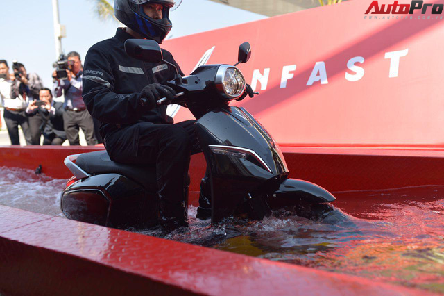 VinFast còn chịu chơi khi đưa chiếc xe máy điện ngâm vào trong bể nước suốt 30 phút ở mực nước 0,5 mét. Sau 30 phút, chiếc xe được đưa ra khỏi bể nhưng vẫn chạy bình thường.