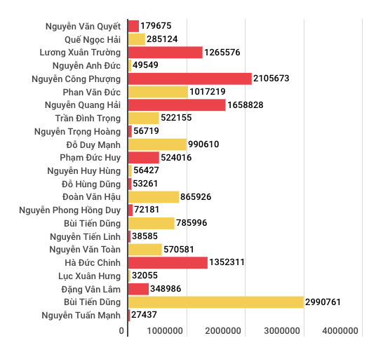Số lượng người theo dõi hoặc nhấn thích tài khoản Facebook của 23 cầu thủ đội tuyển Việt Nam tính đến thời điểm hiện tại.