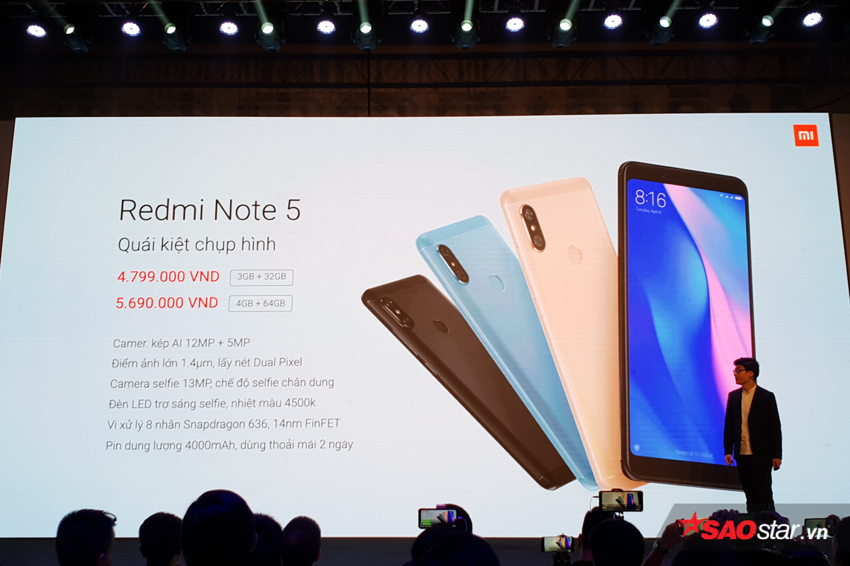 Được biết, Xiaomi Redmi Note5 sẽ có giá bán 4.799.000 đồng đối với phiên bản 3 GB RAM (bán tại FPT Shop trong hai ngày 7 và 8/5) và 5.690.000 đồng đối với phiên bản 4 GB RAM (bán tại TGDD trong 3 ngày 7 đến 9/5)